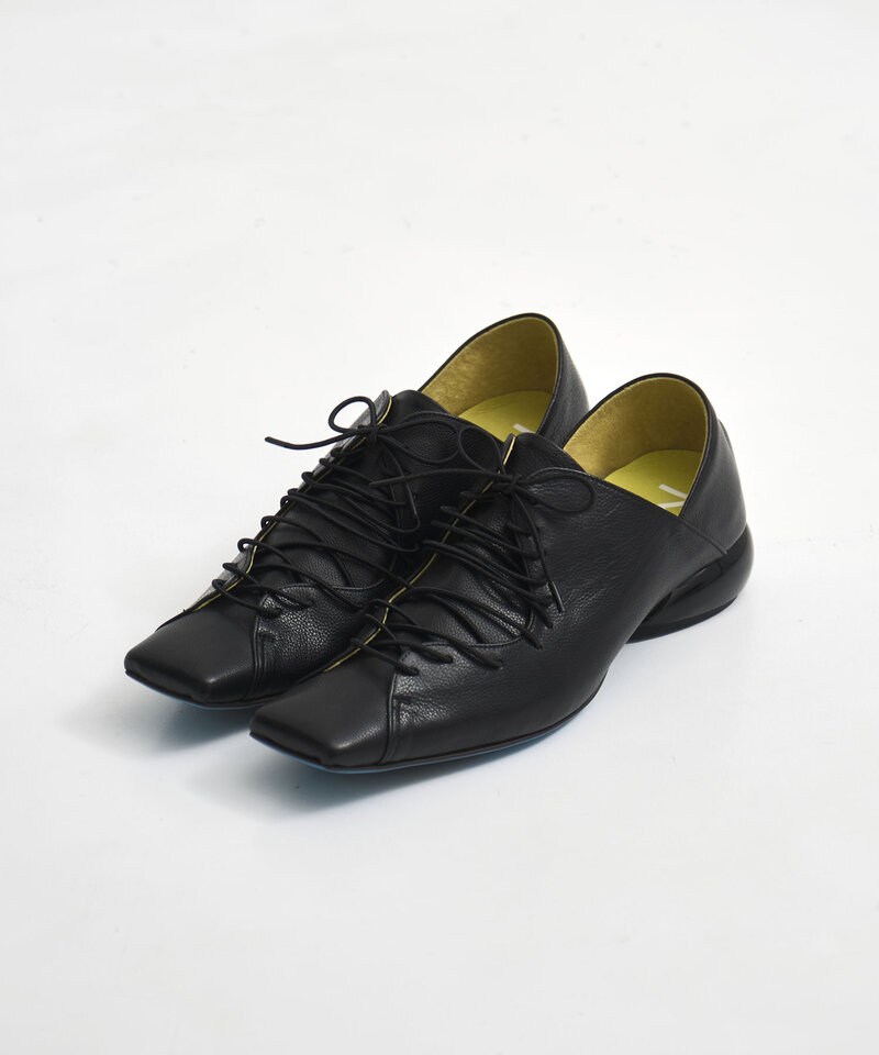 複雑なシューレースが目を引くスクエアトゥシューズ。